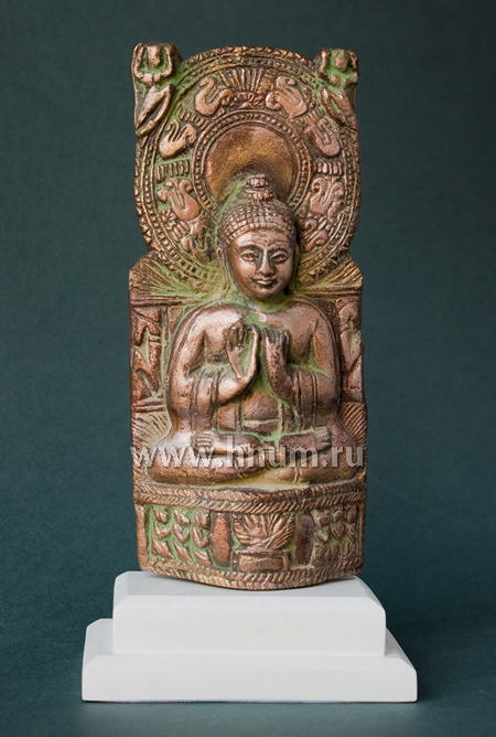 Будда изображён в позе поучения: со скрещенными ногами и руками, сложенными в дхарма-чакра-мудру (жест поучения Закону). Эта поза является наиболее характерной для буддийского канона. Варианты исполнения